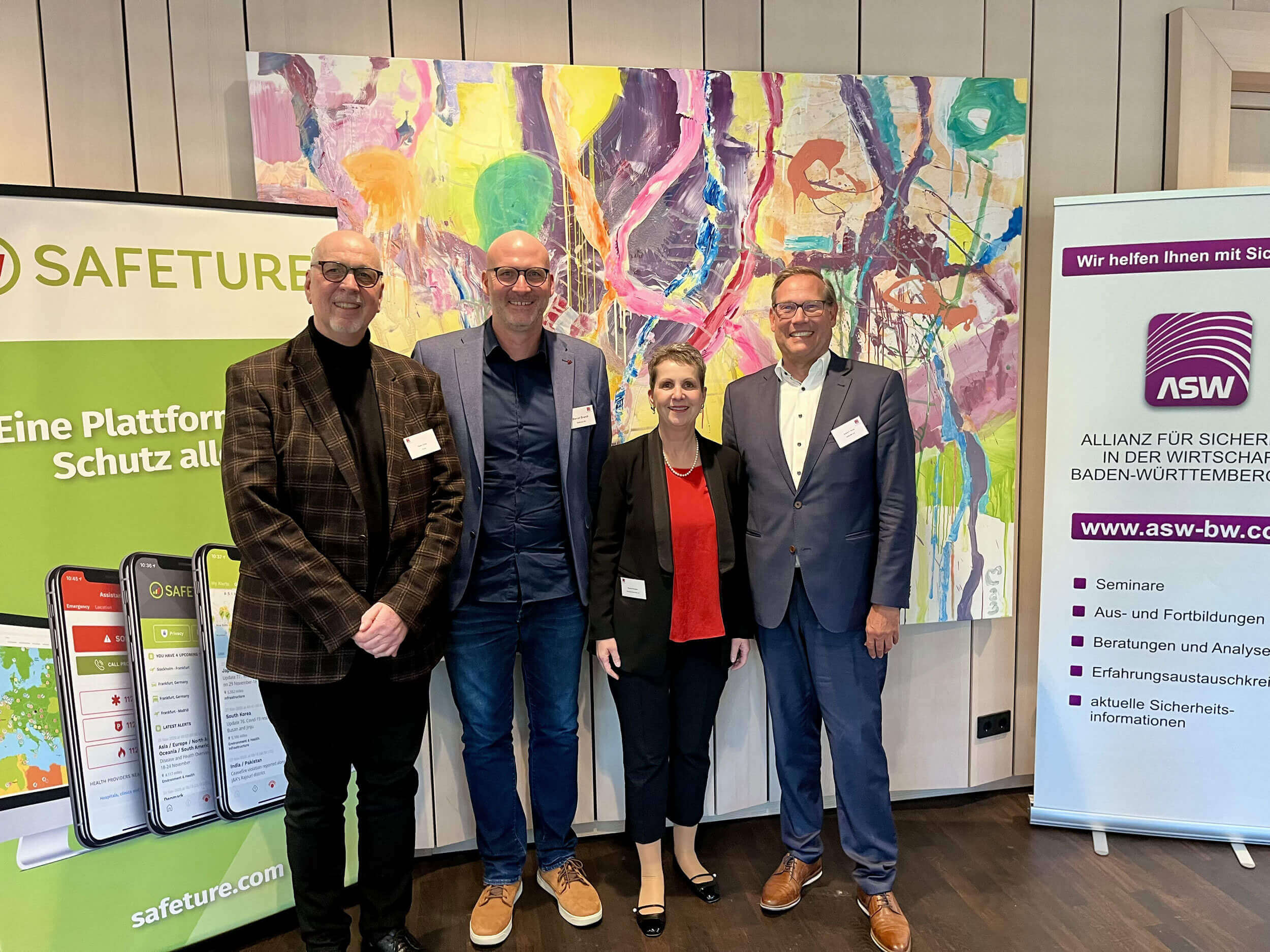 Bild: André F. Kunz, Geschäftsführer ASW BW, Kerstin Zielosko, Vorsitzende Education Unlimited, Marcel Brandt, Chief Sales Officer, Safeture Tübingen, Dieter Zeller, Lehrbeauftragter für Sicherheitsmanagement an der Hochschule für öffentliche Verwaltung Bremen (von...